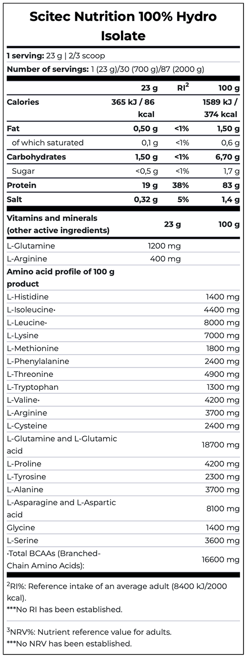 Scitec 100% HYDRO ISOLATE – Is een hoogwaardige eiwitpoeder met gehydrolyseerde eiwit van wei isolaat, L-glutamine, L-arginine en zoetstoffen. Suikervrij. Glutenvrij. Palmolievrij.